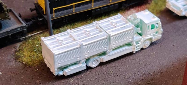 In deze set zijn zowel een exemplaar met 3 containers en HIABkraan toegevoegd, als ook een exemplaar met enkel een chassis, 3 losse containers en een uitgeschoven HIABkraan.