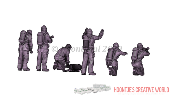 De set bestaat uit 6 verschillende brandweermensen in verschillende dynamische houdingen. Ze dragen een uitrusting zoals deze anno 2021 in gebruik is in onder andere Nederland.