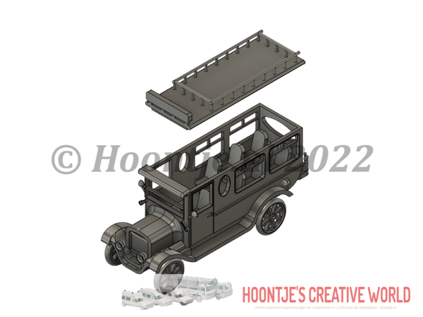 Dit model is uitgevoerd aan de hand van foto's van replica's en originele bouwtekeningen uit 1918 van deze eerste autobussen.